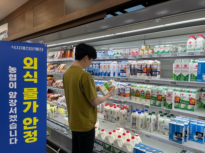 ▲ 농협은 오는 10월부터 전국 하나로마트 매장의 흰우유 대표 품목((900~1000㎖/1팩 기준)을 2,980원 이하로 판매할 예정이다. 하나로마트 신촌점에 방문한 고객이 매대에 진열된 우유 상품을 살펴보고 있다. 농협 제공 |