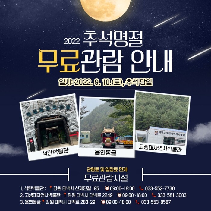 용연동굴은 9일부터 12일까지 추석 연휴기간에 휴무일 없이 무료로 개방하며 석탄박물관과 자연사박물관은 기존대로 월요일에 휴관한다.운영시간은 오전 9시부터 오후 6시까지이다.