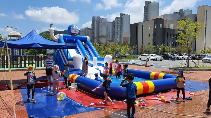 야외 물놀이장에는 아동·유아용 풀장, 미끄럼틀 등 물놀이시설과 그늘막을 설치해 지역민 누구나 선착순 무료로 이용할 수 있도록 했다.