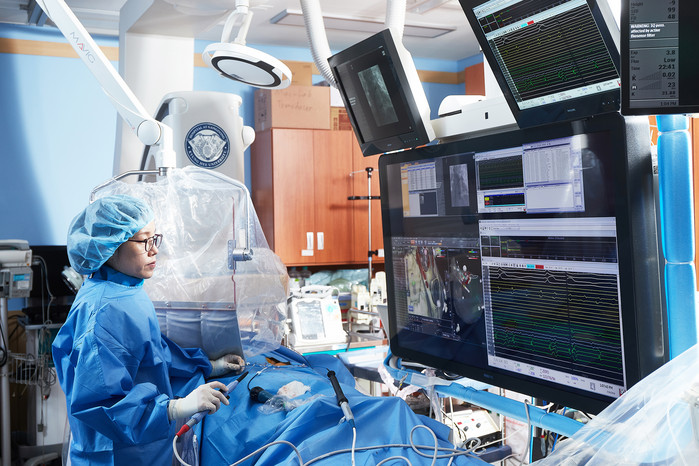 ▲강동경희대병원 심장혈관내과 진은선 교수가 부정맥 시술을 하고 있다. [강동경희대병원 제공] |