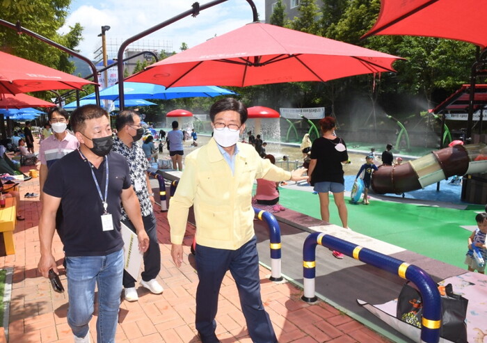 ▲정종복 기장군수가 3일 오후 윗골공원 야외 물놀이장을 찿아 안전사고 예방을 위한 현장점검을 하고 있다. 기장군 제공 |