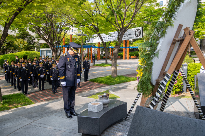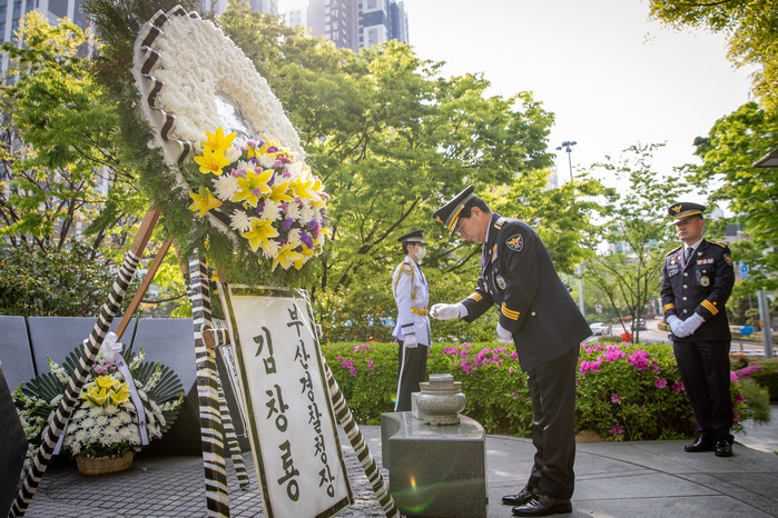 한편 김창룡 부산청장과 직원 협의회 대표 등 30여 명도 부산청 동백광장에 마련된 부산경찰 추모공간에서 별도의 참배를 가겼다. 추모공간에는 순국경찰관들의 희생과 충정을 참수리 날개로 형상화환 추모비가 2009년에 조성됐고 2013년에는 같은 장소에 흉상부조를 건립해 순국경찰관의 넋을 기리고 고귀한 희생정신을 되새겨 오고 있다.