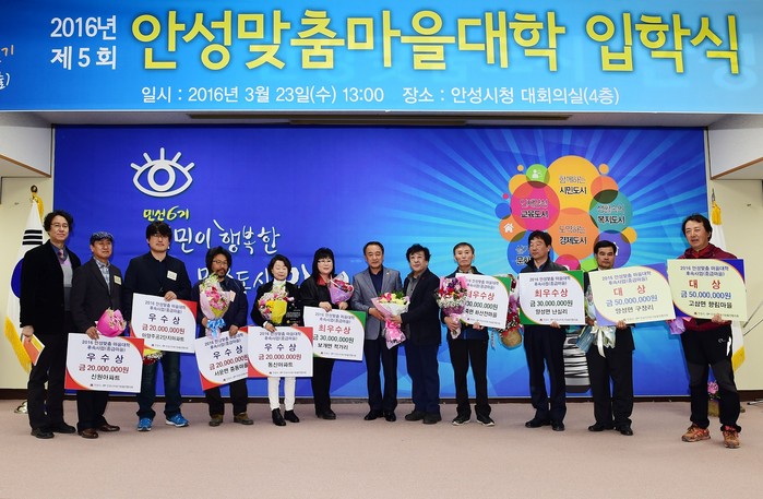 올해로 6회째를 맞는 안성맞춤 마을대학은 2014년 전국 행복마을 만들기 콘테스트에서 국무총리상 수상, 2016년 행정자치부 자치단체 생산성 대상에서 우수사례에 선정되는 등 사업의 독창성과 우수성을 인정받은바 있다.