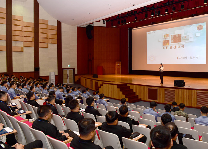 이날 교육은 지난 7월 러시아 해군 최첨단 잠수정 화재로 인해 14명의 승무원이 사망함에 따라 ▲화재 시 신속한 탈출을 위한 비상구 확인 ▲밀폐된 군함 내에서 비상탈출용 호흡구(EEBD) 활용법 ▲소화기 종류별 (분말 . 폼 . CO₂) 올바른 사용법과 관리법 ▲옥내소화전 등 소방시설 활용법 등으로 진행했다.