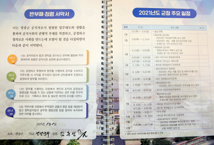 [로컬세계 오승용 기자]김준성 영광군수를 비롯한 900여 영광군 공직자 모두가 공정하고 청렴한 영광군을 만들겠다는 다짐을 하며 반부패·청렴 서약서 서명과 함께 2021년 청렴 영광군 재도약을 위한 힘찬 발걸음을 내딛었다.