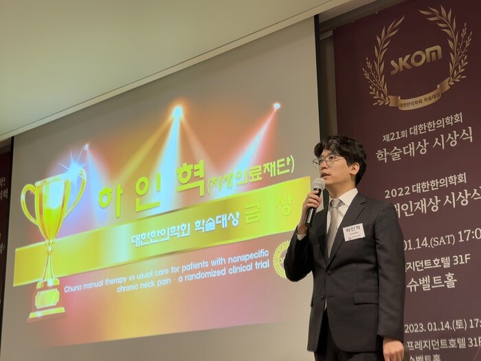 대한한의학회 학술대상은 국내 한의학 학술연구와 학술활동을 제고하기 위해 제정된 상이다. 매년 한의학 발전에 공로가 큰 학술연구자를 대상으로 금상 1명, 은상 1명, 동상 2명 등 4명을 선정한다. 이날 하인혁 소장은 ‘비특이 만성 경항통에서 추나치료와 통상치료의 비교 : 무작위 대조연구(Chuna Manual therapy versus usual care for non-specific chronic neck pain: a multicenter, pragmatic, randomized controlled trial)’ 논문으로 가장 높은 금상을 수상했다.