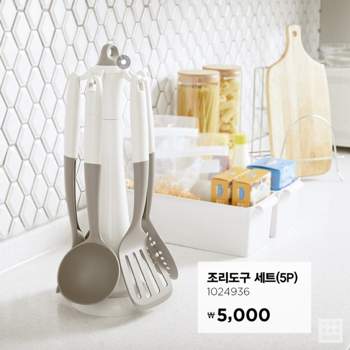 주방용품은 인테리어 효과를 같이 얻을 수 있는 상품 위주로 판매한다. ‘키친타올 걸이’ 는 수납장이나 문에 걸고 사용할 수 있도록 디자인됐고, ‘스텐 칼&도마꽂이’ 는 칼과 도마를 위생적으로 보관할 수 있게 공간이 나뉘어져 가정이나 1인 가구에서도 사용할 수 있도록 적당한 사이즈로 상품을 선보였다. ‘조리도구 세트’ 는 뒤집개, 국자 등 5종을 거치대와 함께 구성했으며, 5,000원이라는 가격이 눈길을 끄는 아이템이다.