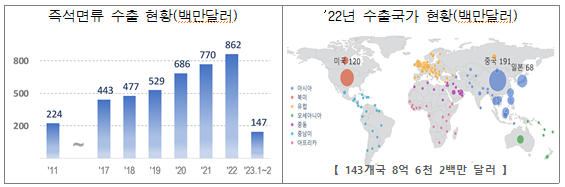수출국별로는 중국(1억 9100만 달러), 미국(1억 2000만 달러), 일본(6800만 달러) 순으로 많았다. 수출 국가도 매년 확대돼 지난해에는 사상 최다인 총 143개국에 수출이 이뤄졌다.
