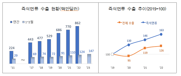 이는 역대 가장 많은 수출액이다. 즉석 면류 수출액은 2014년부터 매년 최대 수출액을 경신하고 있다.