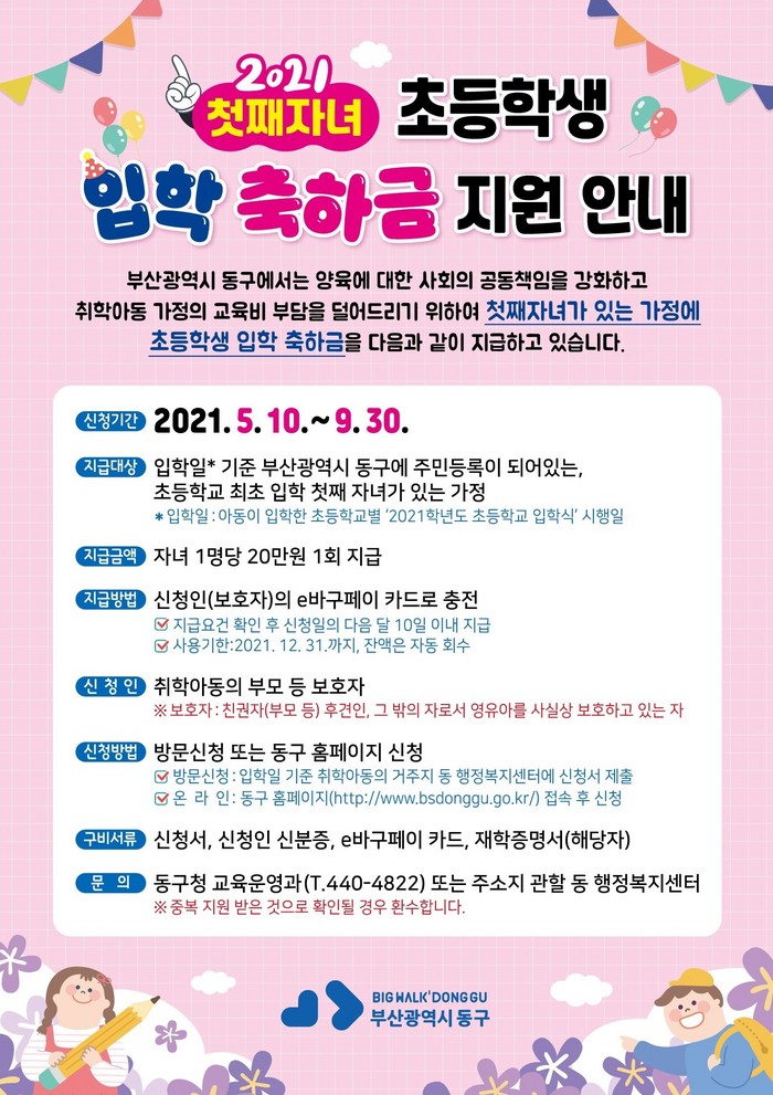 소득수준에 관계없이 입학일 기준 부산광역시 동구에 주민등록이 되어있는 초등학교 최초 입학 첫째자녀에게 지급되며, 둘째 이후 자녀는 부산시에서 지원하고 있다.