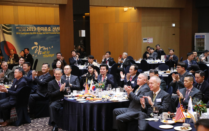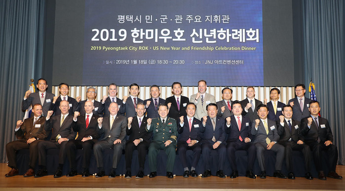 [로컬세계 고용주 기자]경기 평택시는 지난 18일 JNJ 아트컨벤션에서 관내 민·군·관 주요 지휘부 30여 명을 초청 ‘2019 한미우호 신년 하례회’를 열었다고 19일 밝혔다.