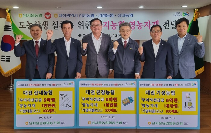 남서울농협(조합장 안용승)은 도농상생 실천의 일환으로 대전 기성농협(조합장 박철규), 산내농협(조합장 송경영), 진잠농협(조합장 김종우)에 각 무이자선급금 5억원과 맞춤형 영농자재 각 1천만원, 총 15억원의 무이자선급금과 3천만원 상당의 맞춤형 영농자재를 전달했다.