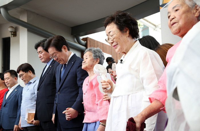| ▲이재명 지사가 11일 오전 광주 나눔의 집에서 열린 ‘일본군 성노예 피해자 기림일(8월14일)’행사에서 일본정부를 향해 진정어린 사과와 배상을 촉구하며, '참혹한 인권침해의 역사적 사실을 유네스코 세계기록 유산으로 등재'해야 한다고 강조했다. |