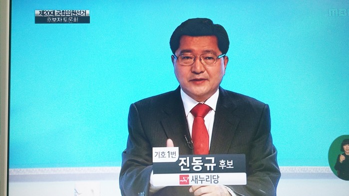 ▲ 지난 31일 밤 11시 진행된 대전MBC 제20대 국회의원선거(대전유성갑) 후보자 토론회에서 새누리당(기호 1번) 진동규 후보가 기조연설을 하고 있다.(화면 캡처) |