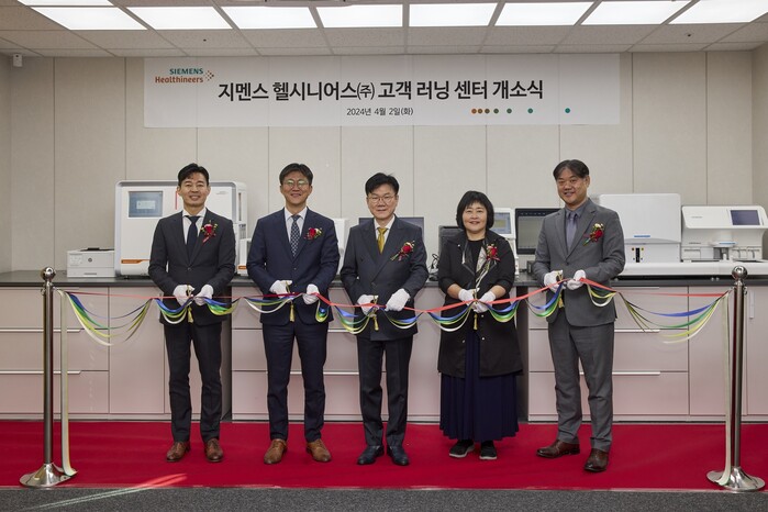 ▲2일 진행된 지멘스 헬시니어스(주) ‘러닝 센터‘ 개소식 모습 (좌측부터 김동휘 센터장/박영배 진단사업본부장/이명균 대표이사/조영란 수석팀장/김명석 팀장) |