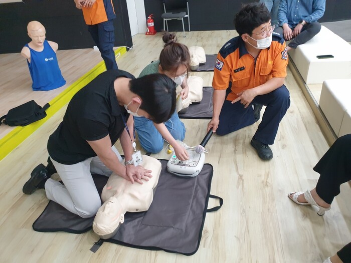특히 이날 교육은 응급 상황 발생 시 대처 방법 및 보고체계 안내, 심폐소생술(CPR) 방법과 자동심장충격기(AED) 사용방법, 하임리히법 등에 관한 강의 및 동영상 시청과 함께 전 직원이 직접 몸으로 체험하는 실습 위주의 교육으로 진행됐다.