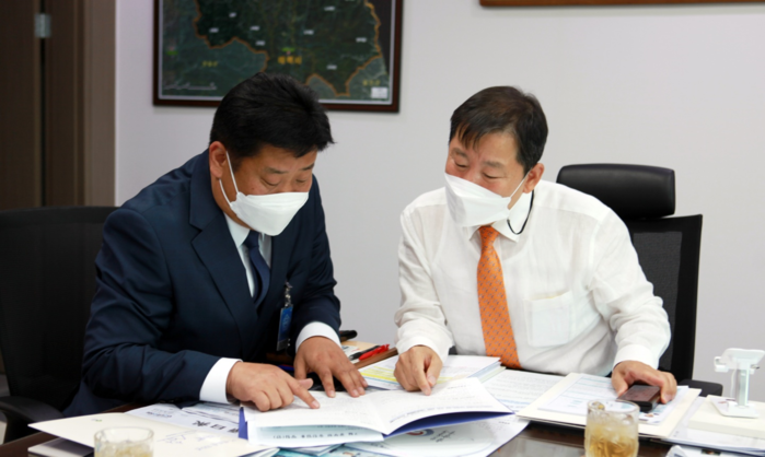 ▲이상호 태백시장 당선인(왼쪽)이 이철규 국회의원(오른쪽)과 면담을 갖고 있다. 태백시 제공 |