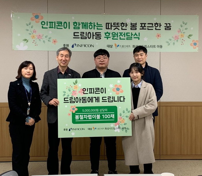 이날 전달식에는 김진관 아동보육과장, 인피콘 관계자, 공직자 등 7명이 참여한 가운데 화성시 드림스타트 아동들에게 총 500만원 상당의 차렵이불 100채를 전달한다는 내용의 후원식을 진행했다.