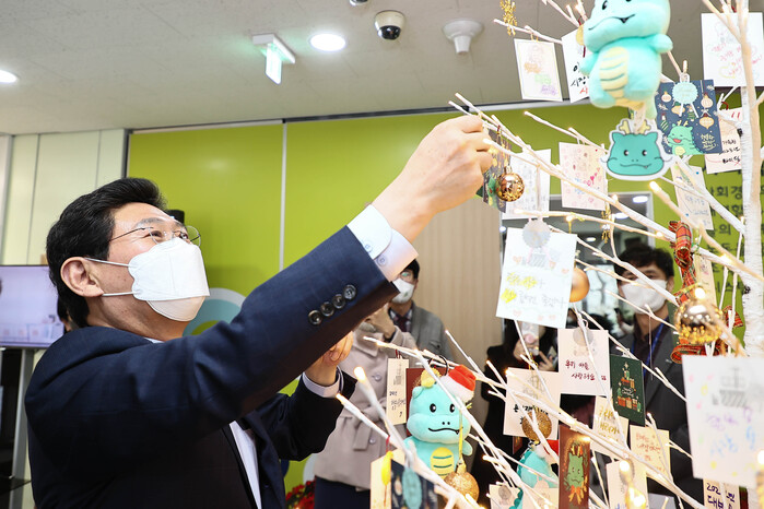 | ▲ 이상일 용인특례시장이 용인지역자활센터 사업보고회에서 소원 나무에 새해 희망이 적힌 카드를 걸고 있다. 용인시 제공 |