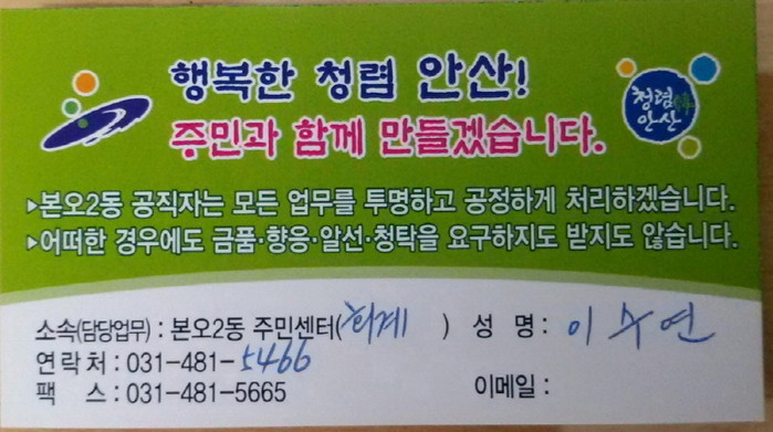 본오2동은 주민들로부터 신뢰받는 청렴한 행정문화 확립을 위해 청렴 직원 명함, 이달의 청렴 및 친절 우수 직원 선정, 청렴액자 제작 등으로 주민들에게 좋은 인상을 보여주고 있다.