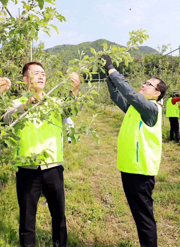 ▲여영현 농협 상호금융대표이사(오른쪽)가 9일 경기도 포천시 소재 농가를 방문해 사과꽃 따기 작업을 하고 있다. 농협 제공 |
