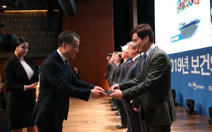 | ▲서철모 화성시장(오른쪽)이 지역맞춤형 보건 사업의 공로를 인정받아 5일 대한상공회의소에서 열린 보건의 날 기념식에서 박능후 보건복지부장관으로부터 대통령 표창을 받고 있다.(화성시 제공) |