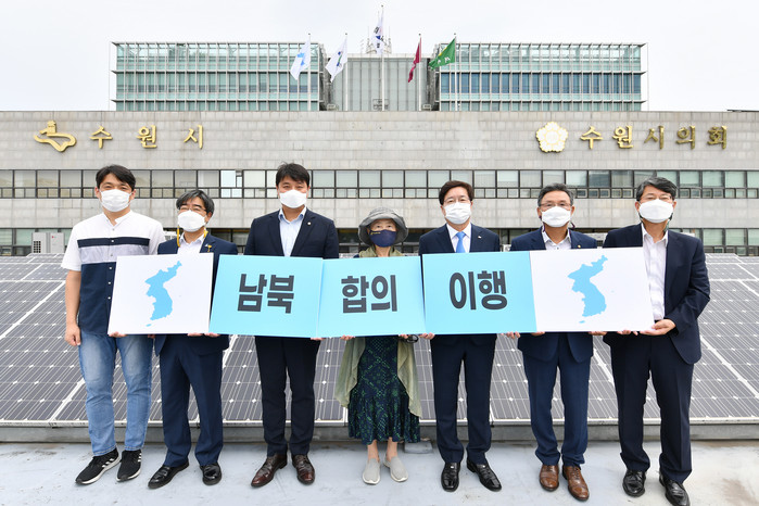 염태영 수원시장, 유문종 수원시 제2부시장, 조석환 수원시의회 의장 등이 ‘남북합의이행’이라고 적힌 카드섹션을 하며 기념촬영하고 있다. 경기 수원시는 광복 76주년을 기념해 한반도 평화와 번영, 통일을 염원하는 의미를 담아 14일 오전 10시30분 수원시청사에 한반도기를 게양했다. 단일기(한반도기)가 수원시청사에 게양되는 것은 이번이 처음으로 한반도기는 오는 31일까지 게양된다.(사진=수원시 제공)