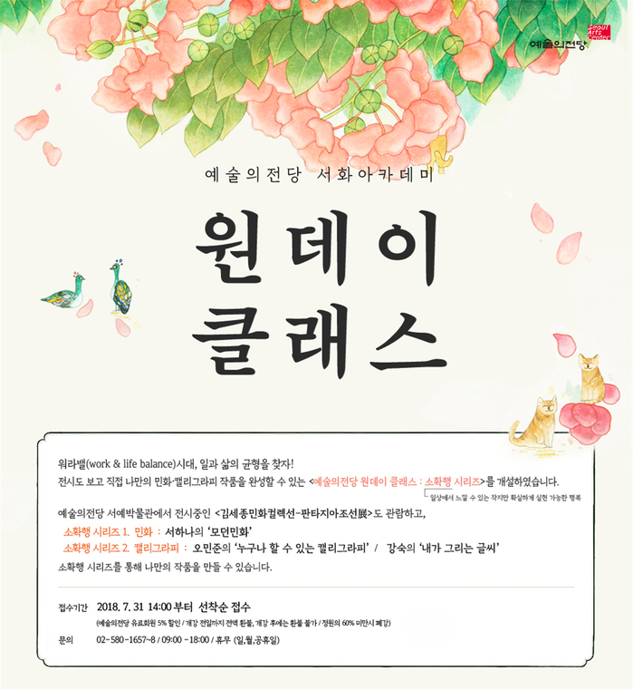 접수는 강좌 당 20명 선착순으로 일일특강으로 준비된 민화 그리기는 5만원, 캘리그래피 쓰기는 3만원이다. 가격은 재료비와 김세종민화컬렉션 ‘판타지아 조선’ 전시 관람료가 포함됐다.
