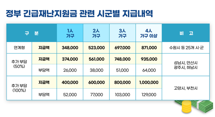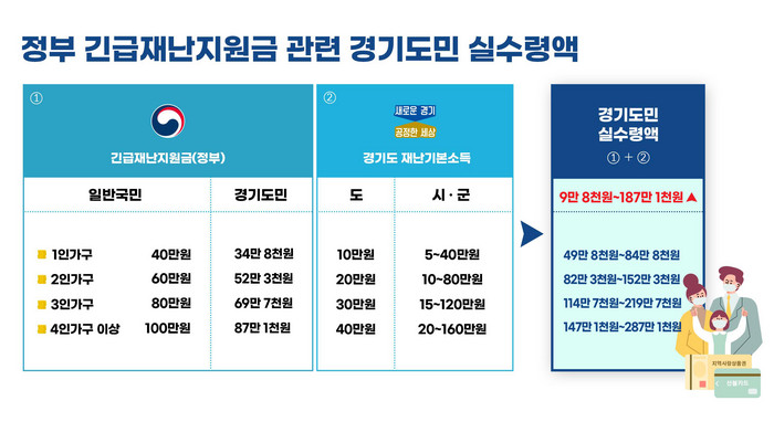 정부의 긴급재난지원금을 시군별로 구체적으로 살펴보면 수원 등 25개 시군은 ▲1인 가구 34만 8천원 ▲2인 가구 52만 3천원 ▲3인 가구 69만 7천원 ▲4인 이상 가구 87만 1천원이다. 나머지 성남 등 6개 시는 자체 재원을 추가 부담해 ▲1인 가구 37만 4천원 ~ 40만원 ▲2인 가구 56만 1천원 ~ 60만원 ▲3인 가구 74만 8천원 ~ 80만원 ▲4인 이상 가구는 93만 5천원 ~ 100만원이 지급될 계획이다.