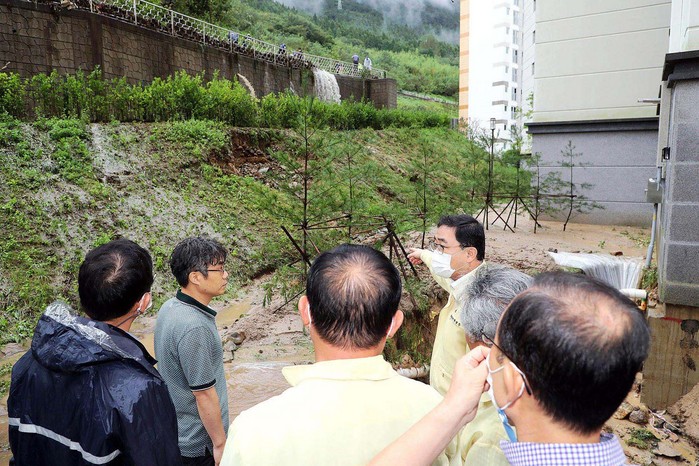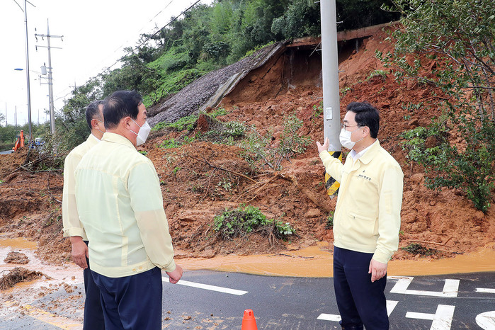 허 시장은 이날 진해구 어은동 도로사면 유실 현장을 비롯해 자은동 냉천중학교와 냉천초등학교 뒤 옹벽 토사 유실 현장을 잇따라 둘러봤다.