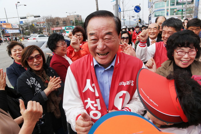 | ▲서청원 새누리당 화성갑 후보가 31일 향남읍 홈플러스 사거리에서 주민들에 둘러 쌓인 채 유세를 펼치고 있다. |