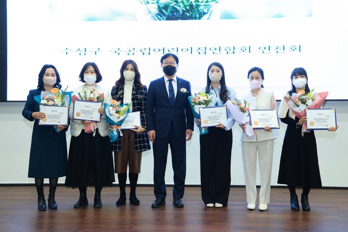 ▲ ‘2022년 국공립어린이집 보육교직원 연찬회’에서 표창장을 수여한 보육교직원들이 김대권 수성구청장과 기념 촬영하고 있다. 대구광역시 제공 |