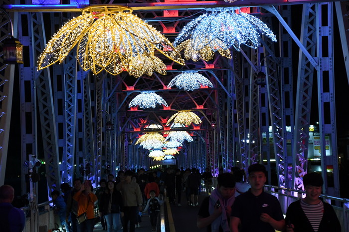 ▲금강교 현란한 빛 터널을 지나고 있는 시민들. |