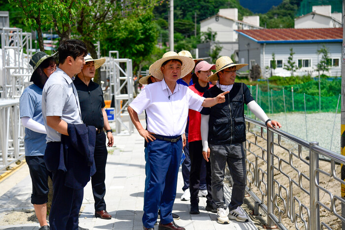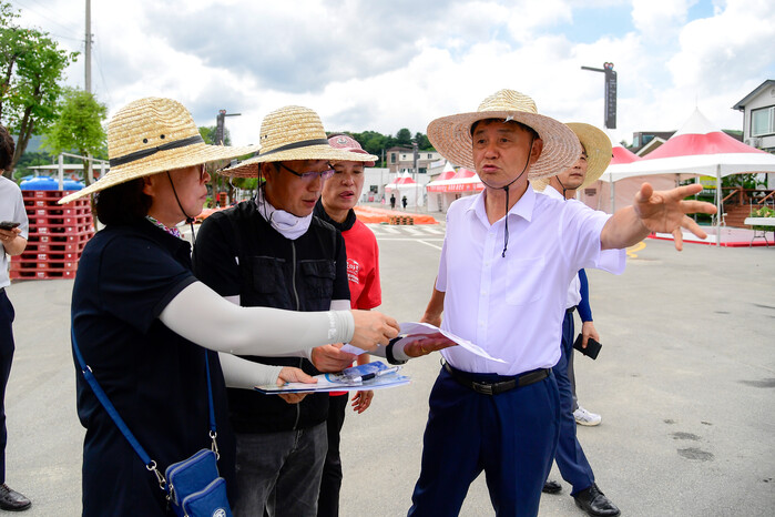최문순 화천군수를 비롯한 군청 각 실과소장, 축제 관계자들이 31일 사내면 사창리 문화마을 일대 2024 화천토마토축제장 인근에서 현장점검을 진행했다. 2024 화천토마토축제는 8월1일부터 4일까지, 나흘 간 치러진다.(사진=화천군 제공)