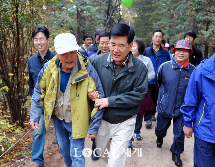 ▲ 18일 배봉산 한마음 걷기 대회 행사에서 유덕열 동대문구청장(가운데)이 어르신을 부축하여 산책길을 오르고 있다. © 로컬세계 |