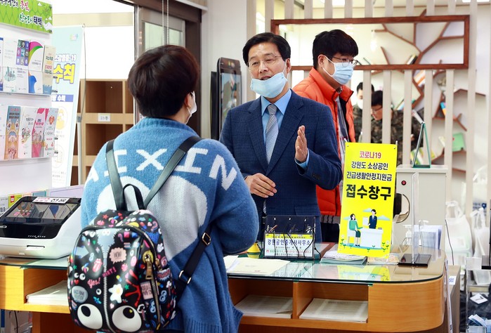 ▲류태호 시장이 강원도 소상공인 긴급생활안정지원금 접수 창구를 찾은 소상공인의 어려움을 듣고 있다.(태백시 제공) |