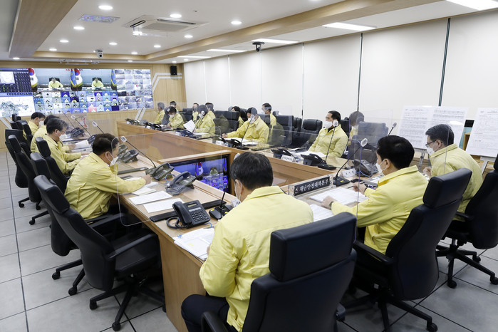 | ▲7일 서철모 화성시장이 재난상황실에서 코로나19 중앙재난안전대책본부 회의(영상회의)를 주재하고 있다. 화성시 제공 |