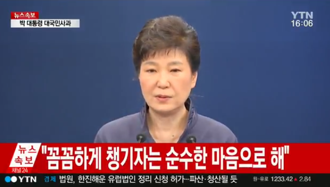 ▲박근혜 대통령이 25일 대국민사과를 하고 있다. 사진은 YTN 화면 캡쳐. |