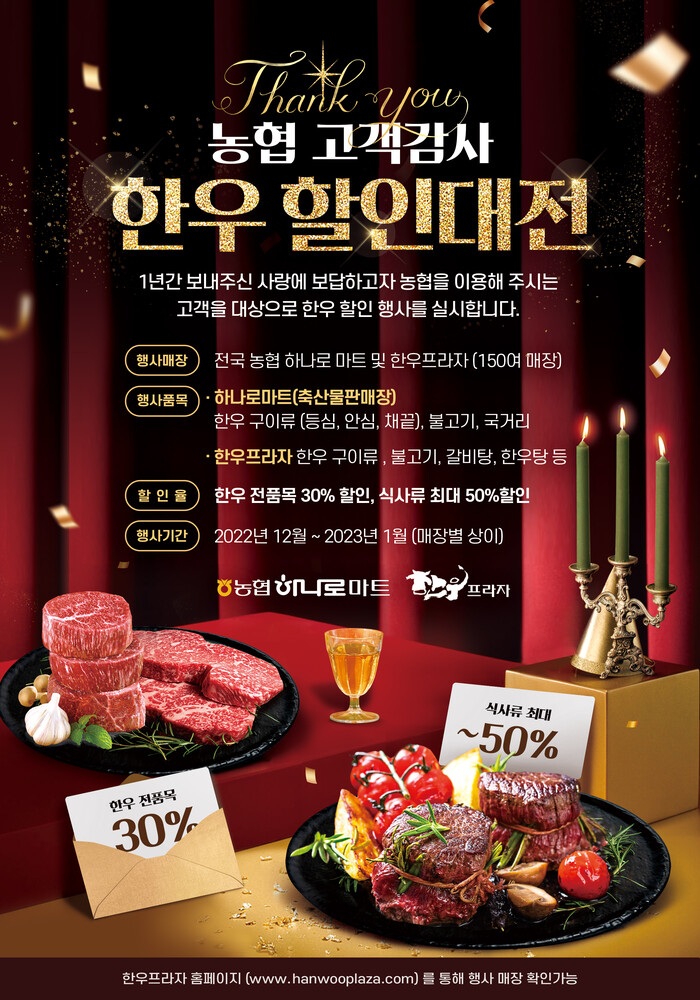 13일부터 12월말까지 전국 농·축협 하나로마트와 축산물판매장 107개 매장에서 구이류(등심, 안심, 채끝), 불고기, 국거리를 30% 할인 판매하며, 내년 1월말까지는 농·축협 한우프라자 43개 매장에서 구이류와 불고기, 육회, 식사류(갈비탕, 한우탕 등)를 최대 50%까지 할인 판매한다. 할인행사에 대한 자세한 내용은 한우프라자와 홈페이지에 게시된 농·축협에 문의하면 된다.