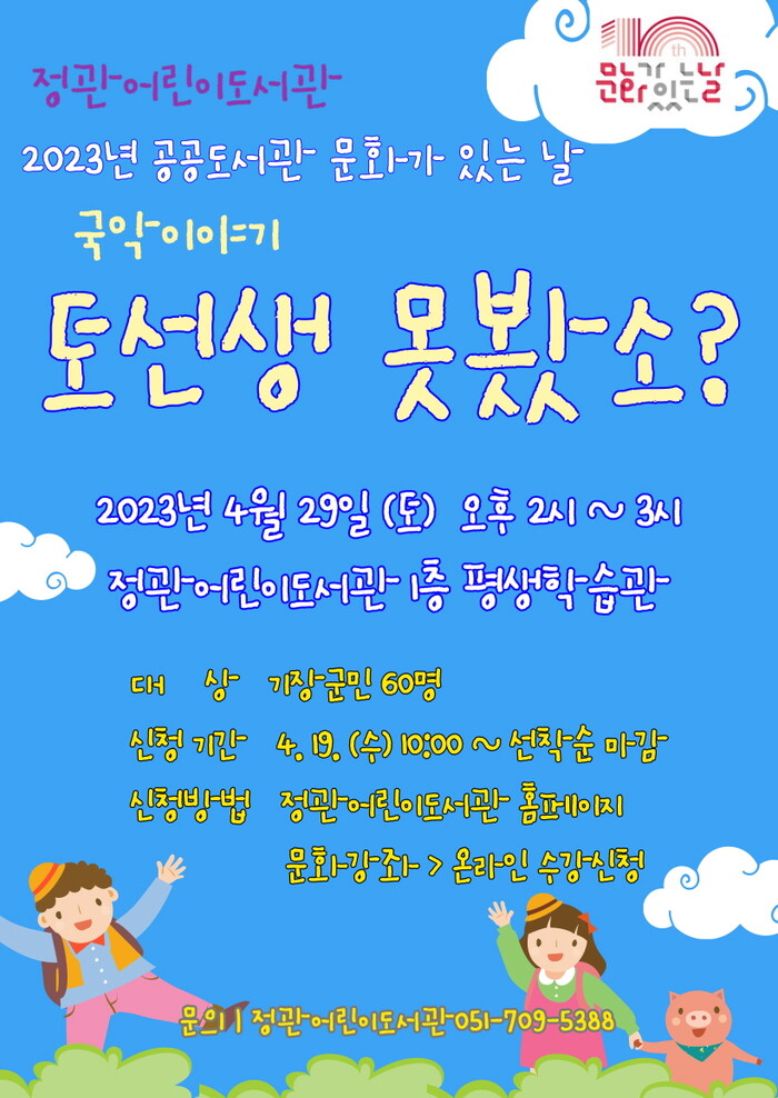 참가신청은 오는 19일 10시부터 정관어린이도서관 홈페이지를 통해 선착순으로 60명을 모집하며, 공연에 대한 자세한 사항은 정관어린이도서관 홈페이지를 참고하거나 기장군 도서관과 정관도서관팀으로 문의하면 된다.