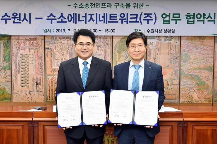 수원시와 수소에너지네트워크(주)(이하 하이넷)는 12일 시청 상황실에서 ‘수소충전소 설치 업무 협약’을 체결하고, 내년 상반기 준공을 목표로 수소충전소 설치에 협력하기로 했다.