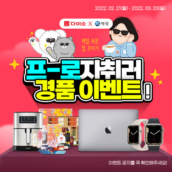 이벤트 기간 내 ‘프로자취러 애경 상품’최대 금액 구매자에게는 맥북 에어(512G), 최다 수량 구매자에게는 애플 워치 7을 증정하고, 추첨을 통해 에어 프라이어 등 다양한 경품을 제공한다. 자세한 사항은 샵(#)다이소 앱에서 확인할 수 있다. 5만 원 초과 경품에 대한 제세공과금(22%)는 본인 부담이다.