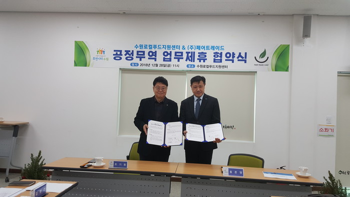 이날 협약식에는 조기동 수원시 생명산업과장과 홍준영 페어트레이드 대표 등이 참석해 건강하고 안전한 공정무역 제품 공급 협력을 약속했다.