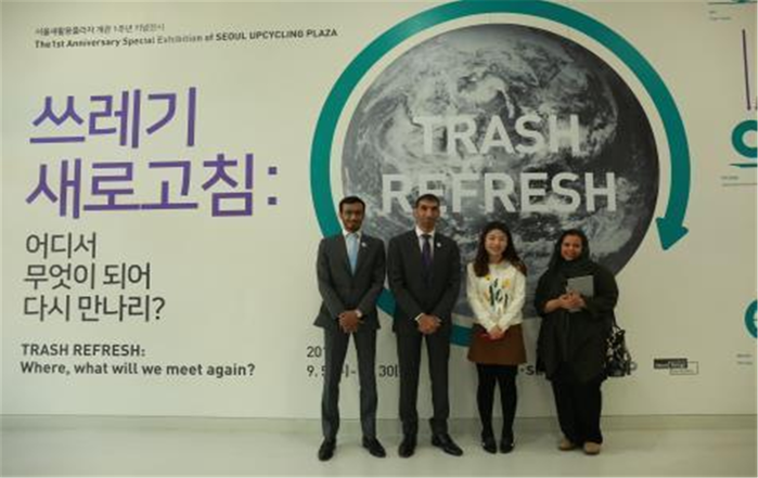 ▲지난해 10월 31일 아랍에미리트 타니 환경부장관(왼쪽에서 두 번째)가 서울새활용플라자를 방문해 쓰레기를 재활용해 만든 제품 전시장과 재활용품 분류작업장 및 교육시설 등을 둘러봤다. 사진은 방문기념 사진. |
