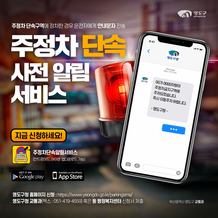 [로컬세계 부산=맹화찬 기자]부산시 영도구는 불법 주정차 차량에 대하여 차량이동을 유도하고 원활한 교통소통을 확보하기 위하여 단속 전에 차량소유자 휴대폰으로 단속사항을 통보하는‘영도구 불법 주정차 단속차량 사전알림 서비스’신청 접수를 받아 운영하고 있다.