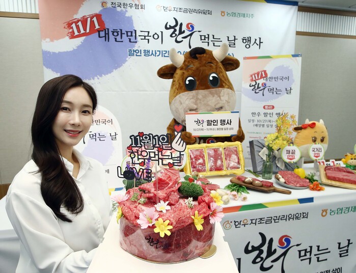27일 오전 서울 중구 한국프레스센터에서 한우자조금관리위원회가 주최한 ‘11/1 대한민국이 한우 먹는 날 맞이 한우 할인판매 행사’ 포토행사에서 여성 홍보모델과 한우자조금 캐릭터가 한우 먹는 날을 맞아 가정에서 온 가족이 함께 부담 없이 즐기기 좋은 우리 한우를 알리고 있다.