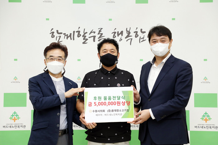▲왼쪽부터 이동훈 버드내노인복지관 관장, 홍종표 홍대장소고기집 대표, 조석환 수원시의회 의장. 수원시의회 제공 |