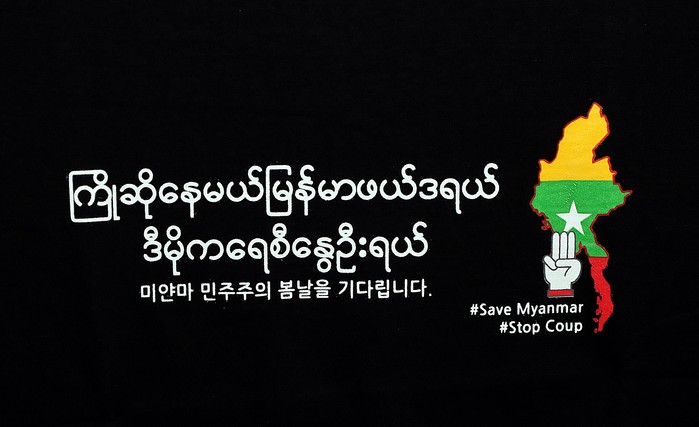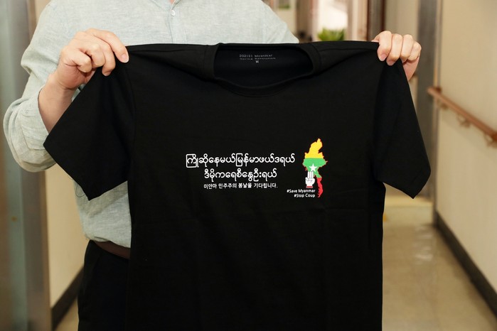 티셔츠에는 ‘미얀마 민주주의 봄날을 기다립니다’란 문구가 한글과 미얀마어로 병행 표기됐다.