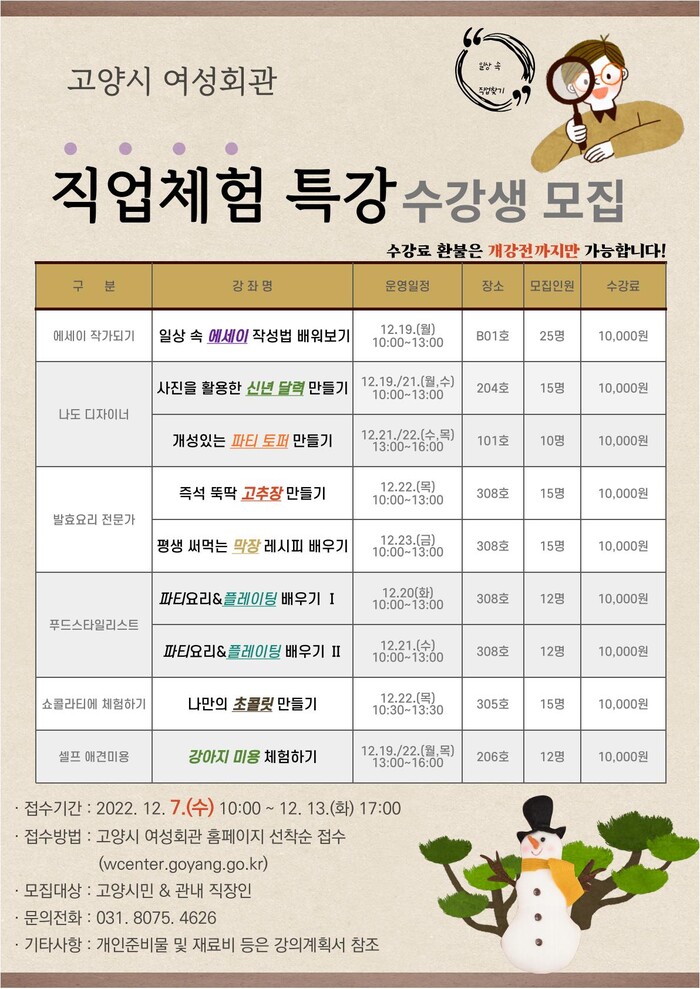 [로컬세계 = 이영원 기자]경기 고양특례시(시장 이동환) 여성회관이 연말에 특별한 경험을 할 수강생을 모집한다.