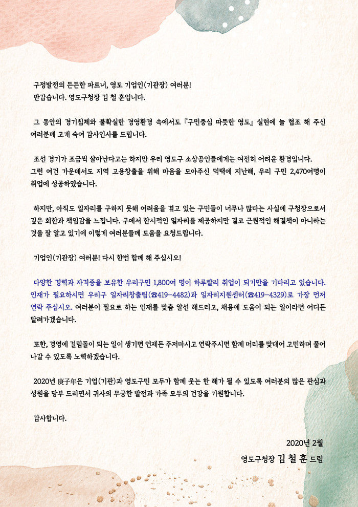 [로컬세계 맹화찬 기자]김철훈 영도구청장은 2월 10일 관내 1,400여개 기업체 및 기관에 구민 채용을 당부하는 내용의 서한문을 발송한다고 7일 밝혔다.